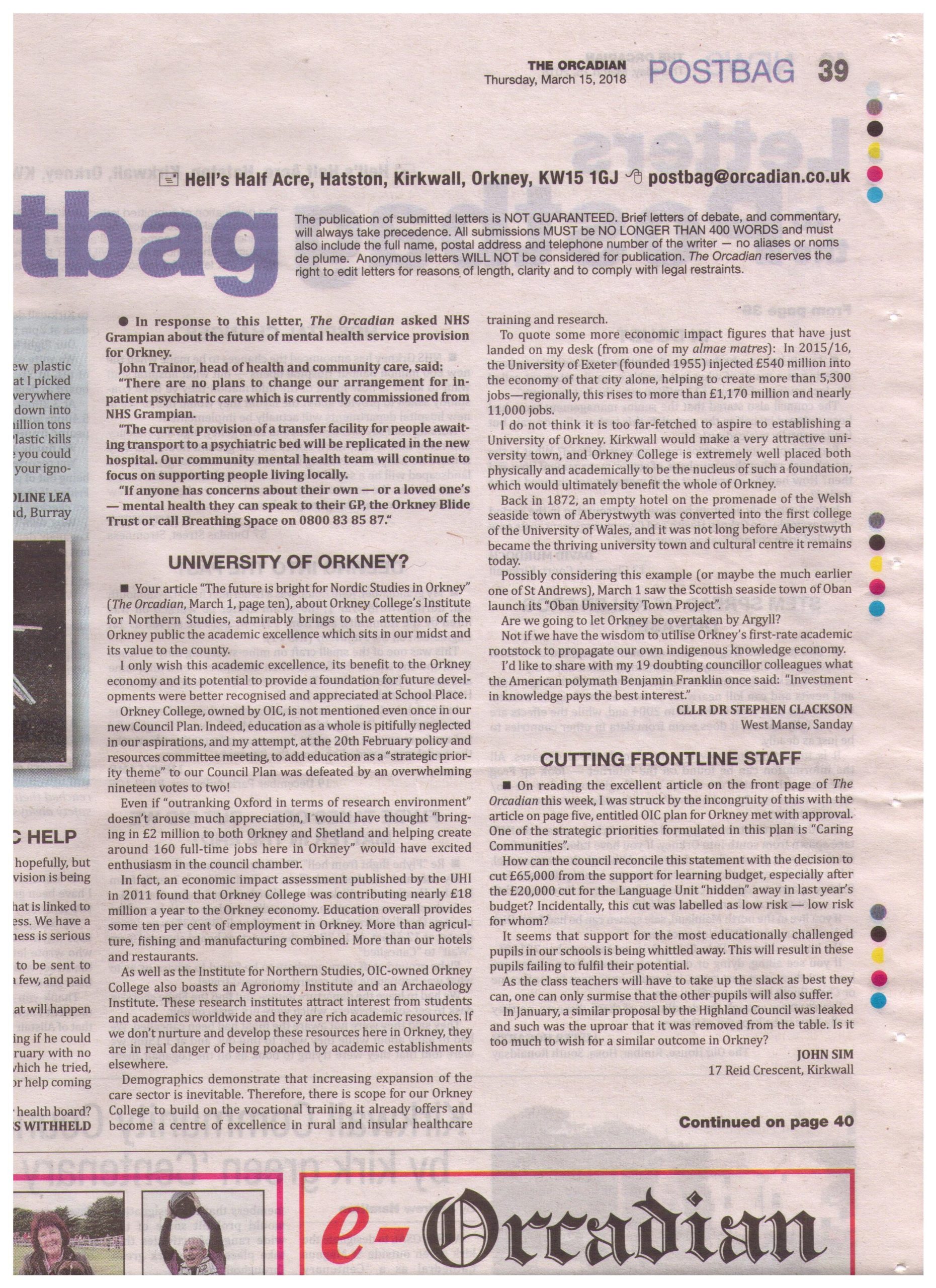 Although confidentiality prevents my giving details, at the meeting of the UHI Orkney Stakeholder Group (formerly Orkney College Management Council), I gained further convincing evidence of the potential our college has, if allowed, to help fulfil my vision for tertiary education in Orkney that I outlined in a letter to The Orcadian back on 15th March 2018. (You can link to the letter here: https://clackson.info/wp-content/uploads/2025/09/Orcadian-15-March-2018-p39-scaled.jpeg .) I hope one day the resistance shall be overcome and this vision will be realised, as, apart from all the other obvious benefits, it could contribute greatly to Orkney’s economy and sustainability. A starting point would be for OIC (which owns the college) to invest in providing suitable student accommodation.